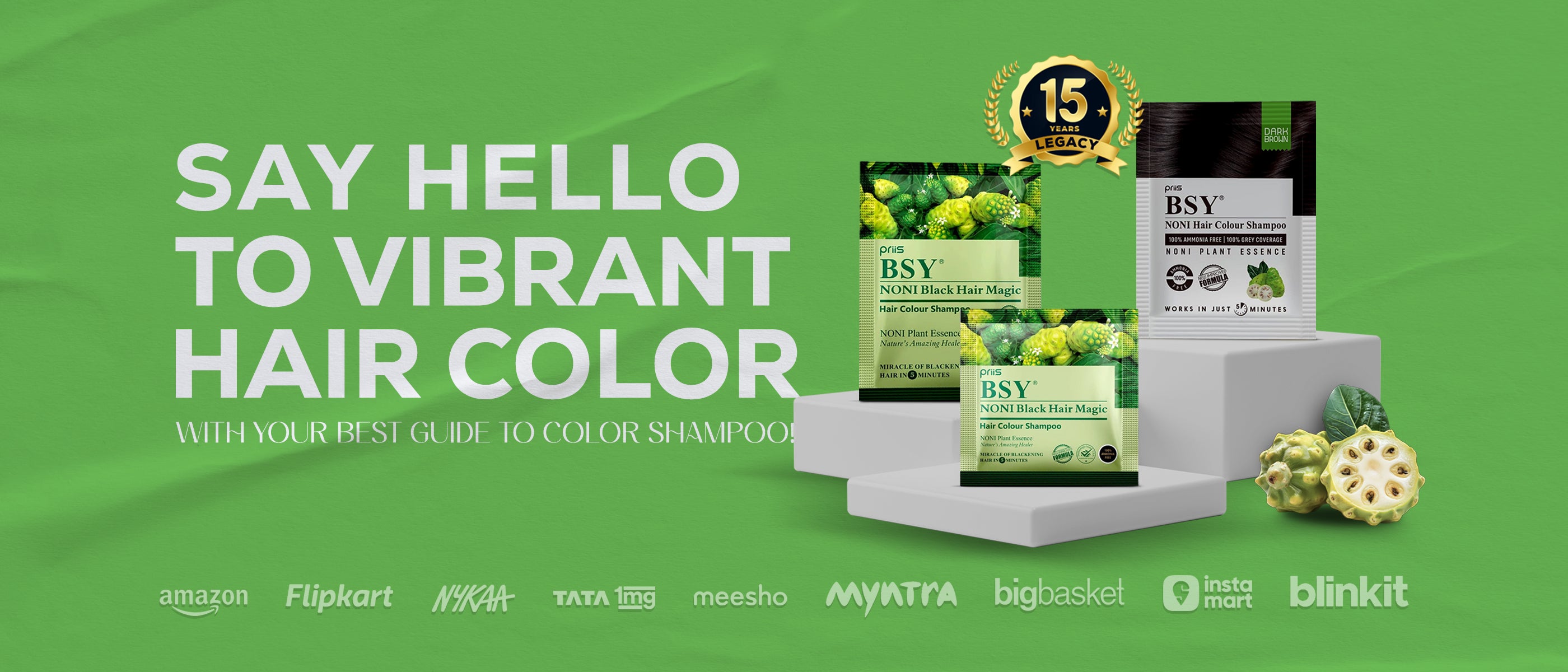 Ans: BSY NONI Hair Colour Shampoo is a hair colouring product that not only colours your hair but also offers additional benefits like controlling hair loss and covering premature graying with NONI fruit extracts.